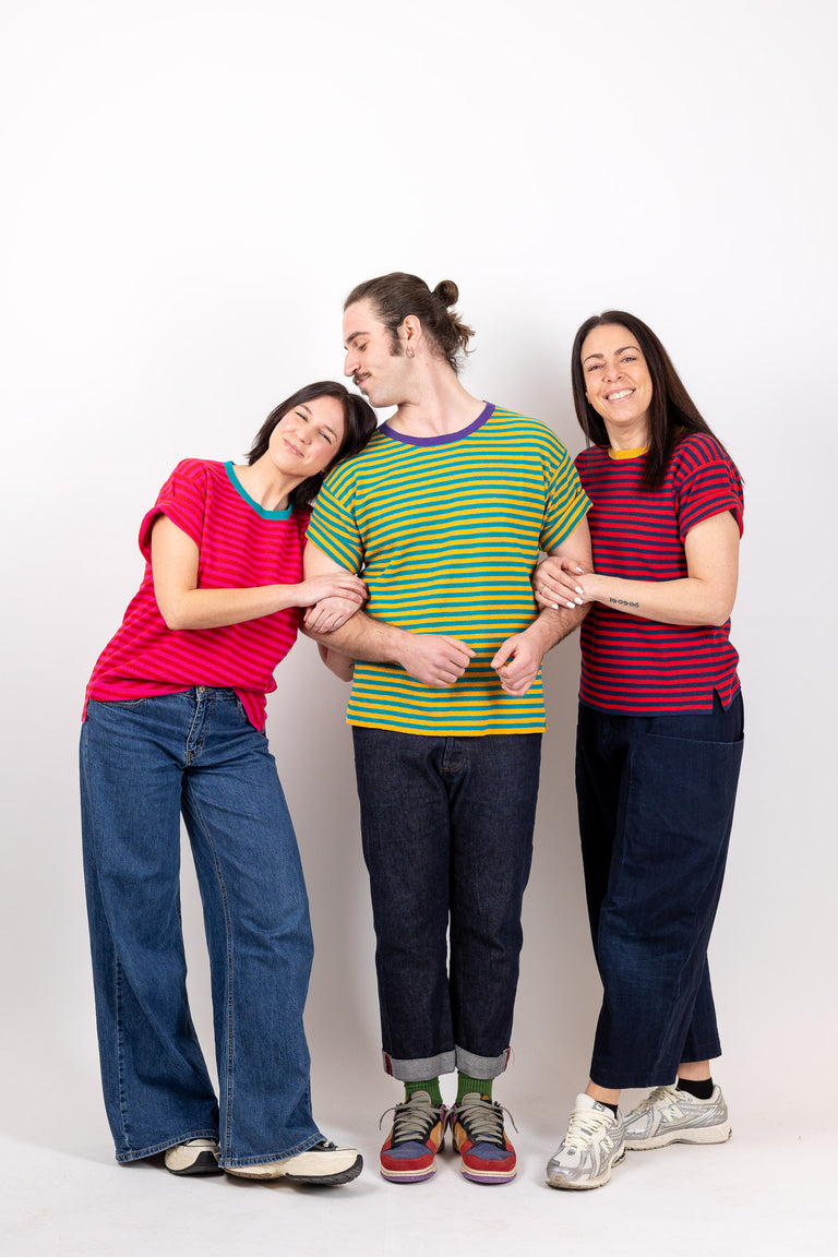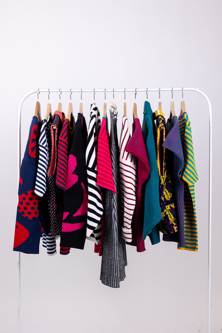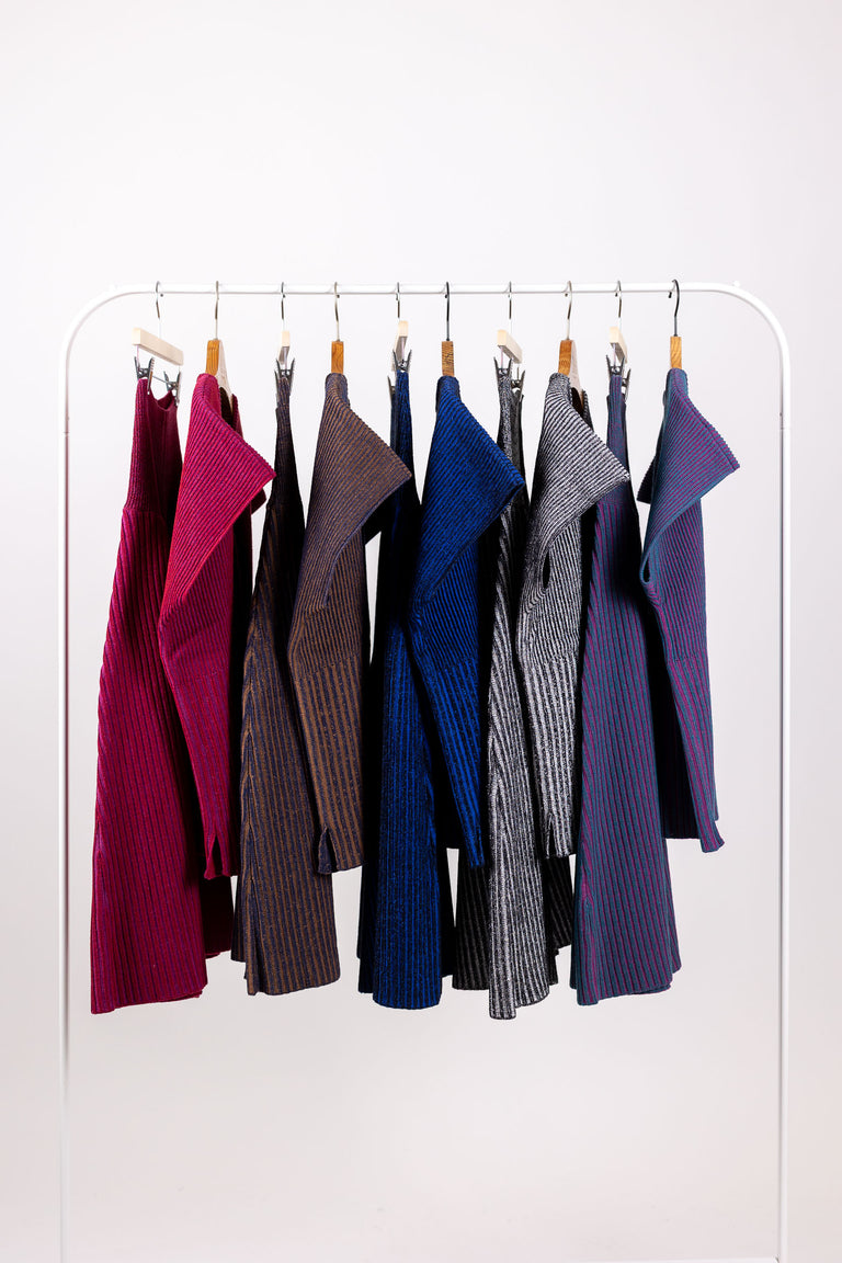 Our garments are iconic and unconventional, not only from an aesthetic standpoint but also in terms of design and production methodology. The yarns used are primarily surplus from production to minimize waste of raw materials.